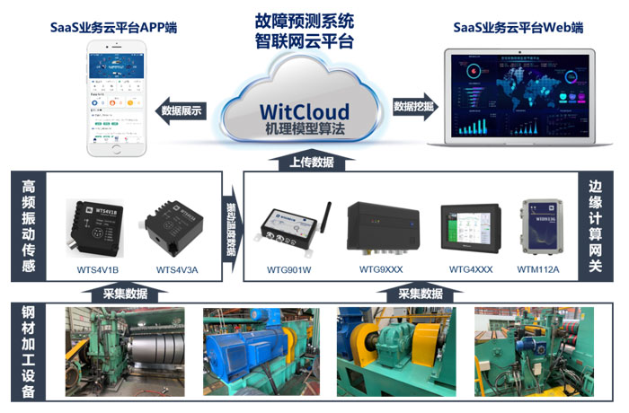 根據(jù)上海輝泰旋轉設備故障預測系統(tǒng)的解決方案,采用精密小體積的WTS4VXX系列工業(yè)振動傳感器,快速適配各類鋼材加工設備并采集振動數(shù)據(jù),對各種工業(yè)數(shù)據(jù)進行預處理,提供多種特征值,如速度均方根、加速度峭度、波峰因素等;并通過邊緣計算網(wǎng)關WTG9XXX系列接入到WitCloud物聯(lián)網(wǎng)數(shù)據(jù)云平臺,利用平臺上的特性樣本庫結合智能算法對數(shù)據(jù)進行機器學習,生成對應的故障預測模型,該模型根據(jù)實時采集的數(shù)據(jù)為客戶提供設備的實時在線監(jiān)控、故障分析、維修建議、健康診斷報告等服務。