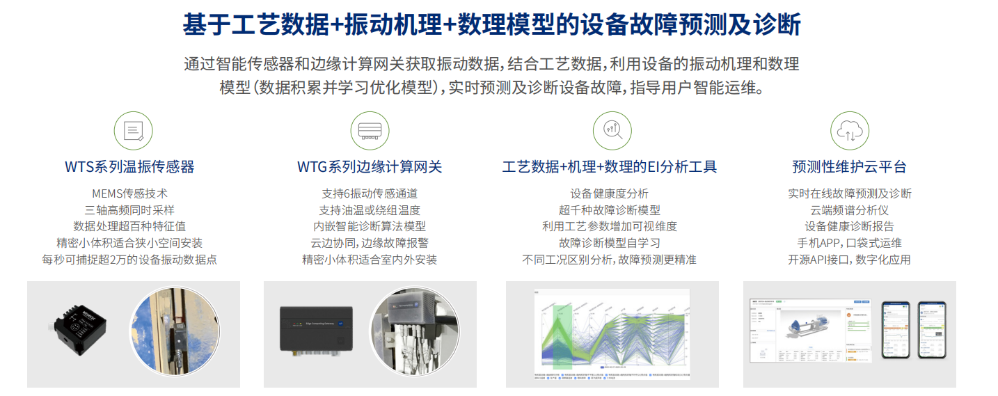 WitExpert工業(yè)設(shè)備預(yù)測(cè)性維護(hù)系統(tǒng)是通過(guò)智能傳感器和邊緣計(jì)算網(wǎng)關(guān)獲取振動(dòng)數(shù)據(jù),利用設(shè)備的振動(dòng)機(jī)理和數(shù)理模型,結(jié)合設(shè)備的工藝數(shù)據(jù),融入人工智能、大數(shù)據(jù)分析、機(jī)器學(xué)習(xí)算法,以及多年在工業(yè)領(lǐng)域設(shè)備故障診斷模型庫(kù)的積累,實(shí)時(shí)預(yù)測(cè)、診斷設(shè)備故障,指導(dǎo)用戶智能運(yùn)維,并提供數(shù)據(jù)可視化、故障預(yù)警、報(bào)表管理、工單管理、點(diǎn)巡檢、智能潤(rùn)滑等功能。幫助企業(yè)解決問(wèn)題,切實(shí)提高設(shè)備管理、運(yùn)營(yíng)效率、產(chǎn)品質(zhì)量和安全環(huán)保水平。